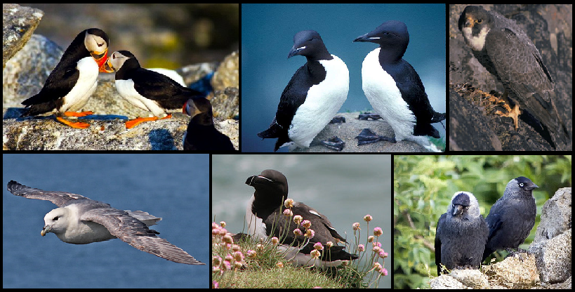 A partir de la fin février, des oiseaux marins tels que les guillemots, les petits pingouins, les goélands marins ou les cormorans huppés de retour de leur migration font leur réapparition du côté des falaises – tandis que les macareux moines reviennent vers la fin mars.