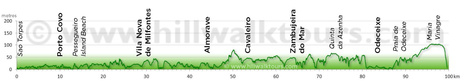 Entre Sao Torpes et un peu avant Vila Nova de Milfontes, l’itinéraire reste essentiellement proche du niveau de la mer, avec quelques petites montées et descentes. Après Vila Nova de Milfontes, vous marchez généralement à travers des dunes et des broussailles en haut des falaises qui se trouvent entre 30 et 50 m au-dessus du niveau de la mer.